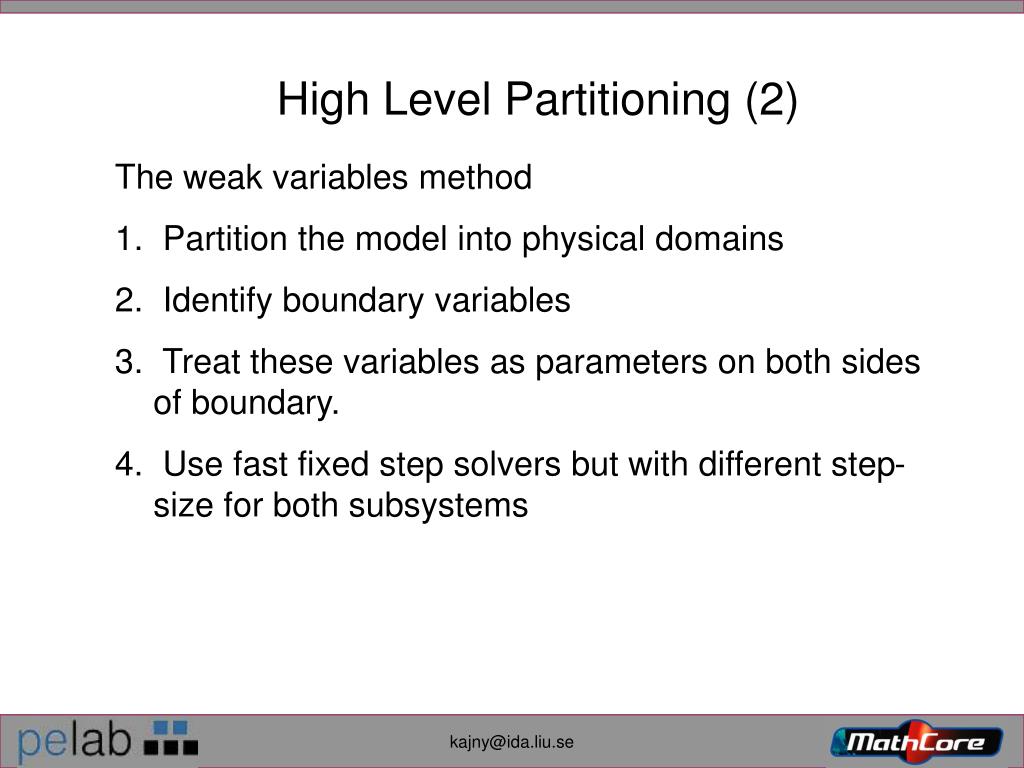 High Level Partitioning (2) • The weak variables method • Partition the model into physical domains • Identify boundary variables • Treat these variables as parameters on both sides of boundary. • Use fast fixed step solvers but with different step-size for both subsystems kajny@ida.liu.se
