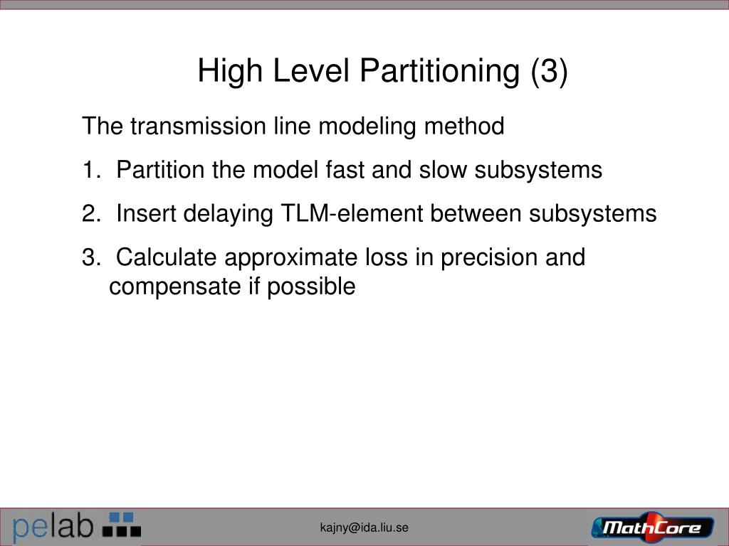 High Level Partitioning (3) • The transmission line modeling method • Partition the model fast and slow subsystems • Insert delaying TLM-element between subsystems • Calculate approximate loss in precision and compensate if possible kajny@ida.liu.se