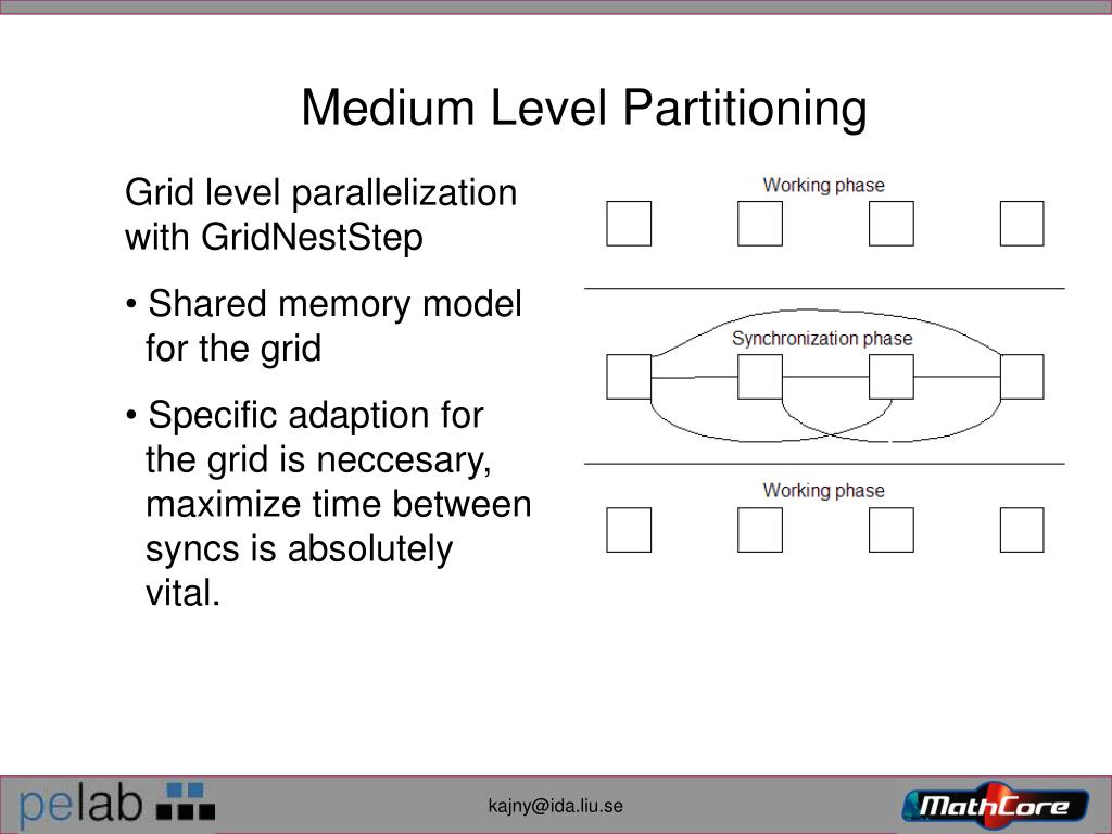 Medium Level Partitioning • Grid level parallelization with GridNestStep • Shared memory model for the grid • Specific adaption for the grid is neccesary, maximize time between syncs is absolutely vital. kajny@ida.liu.se