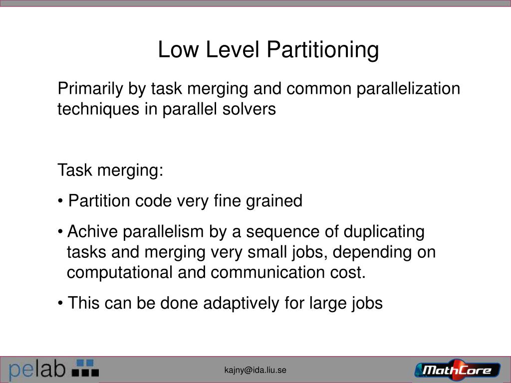 Low Level Partitioning • Primarily by task merging and common parallelization techniques in parallel solvers • Task merging: • Partition code very fine grained • Achive parallelism by a sequence of duplicating tasks and merging very small jobs, depending on computational and communication cost. • This can be done adaptively for large jobs kajny@ida.liu.se