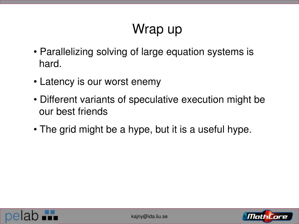 Wrap up • Parallelizing solving of large equation systems is hard. • Latency is our worst enemy • Different variants of speculative execution might be our best friends • The grid might be a hype, but it is a useful hype. kajny@ida.liu.se