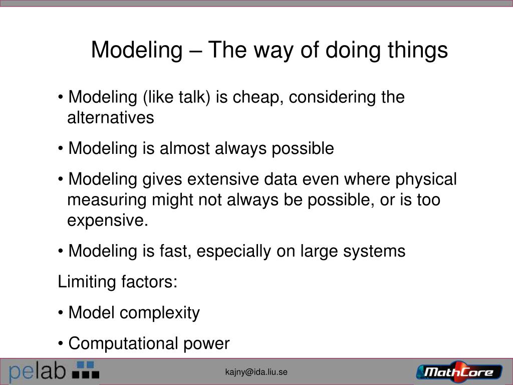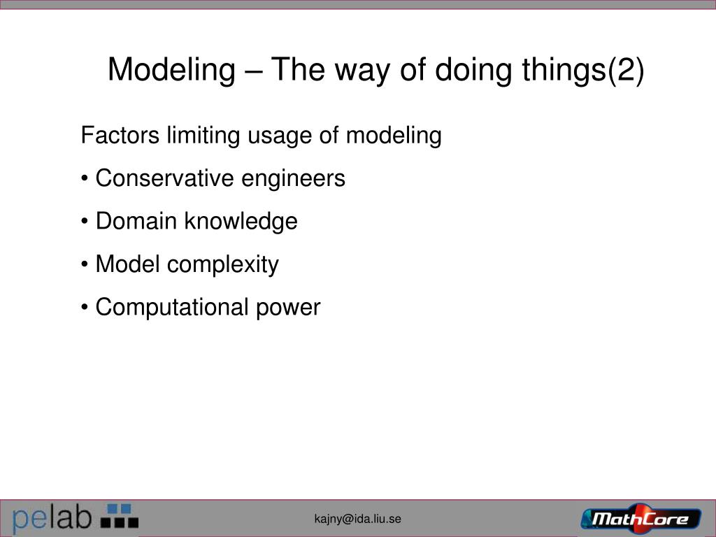 Modeling – The way of doing things(2) • Factors limiting usage of modeling • Conservative engineers • Domain knowledge • Model complexity • Computational power kajny@ida.liu.se