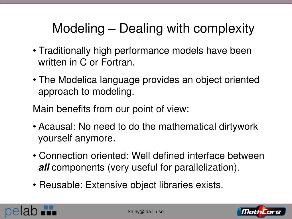 Modeling – Dealing with complexity • Traditionally high performance models have been written in C or Fortran. • The Modelica language provides an object oriented approach to modeling. • Main benefits from our point of view: • Acausal: No need to do the mathematical dirtywork yourself anymore. • Connection oriented: Well defined interface betweenall components (very useful for parallelization). • Reusable: Extensive object libraries exists. kajny@ida.liu.se