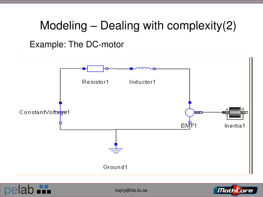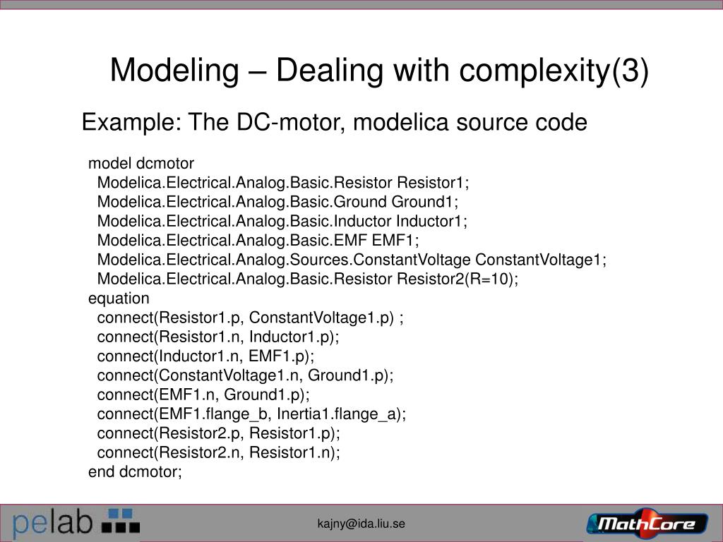 Modeling – Dealing with complexity(3) Example: The DC-motor, modelica source code model dcmotor Modelica.Electrical.Analog.Basic.Resistor Resistor1; Modelica.Electrical.Analog.Basic.Ground Ground1; Modelica.Electrical.Analog.Basic.Inductor Inductor1; Modelica.Electrical.Analog.Basic.EMF EMF1; Modelica.Electrical.Analog.Sources.ConstantVoltage ConstantVoltage1; Modelica.Electrical.Analog.Basic.Resistor Resistor2(R=10); equation connect(Resistor1.p, ConstantVoltage1.p) ; connect(Resistor1.n, Inductor1.p); connect(Inductor1.n, EMF1.p); connect(ConstantVoltage1.n, Ground1.p); connect(EMF1.n, Ground1.p); connect(EMF1.flange_b, Inertia1.flange_a); connect(Resistor2.p, Resistor1.p); connect(Resistor2.n, Resistor1.n); end dcmotor; kajny@ida.liu.se