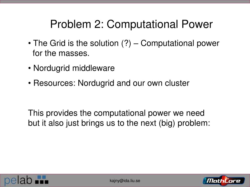 Problem 2: Computational Power • The Grid is the solution (?) – Computational power for the masses. • Nordugrid middleware • Resources: Nordugrid and our own cluster • This provides the computational power we needbut it also just brings us to the next (big) problem: kajny@ida.liu.se