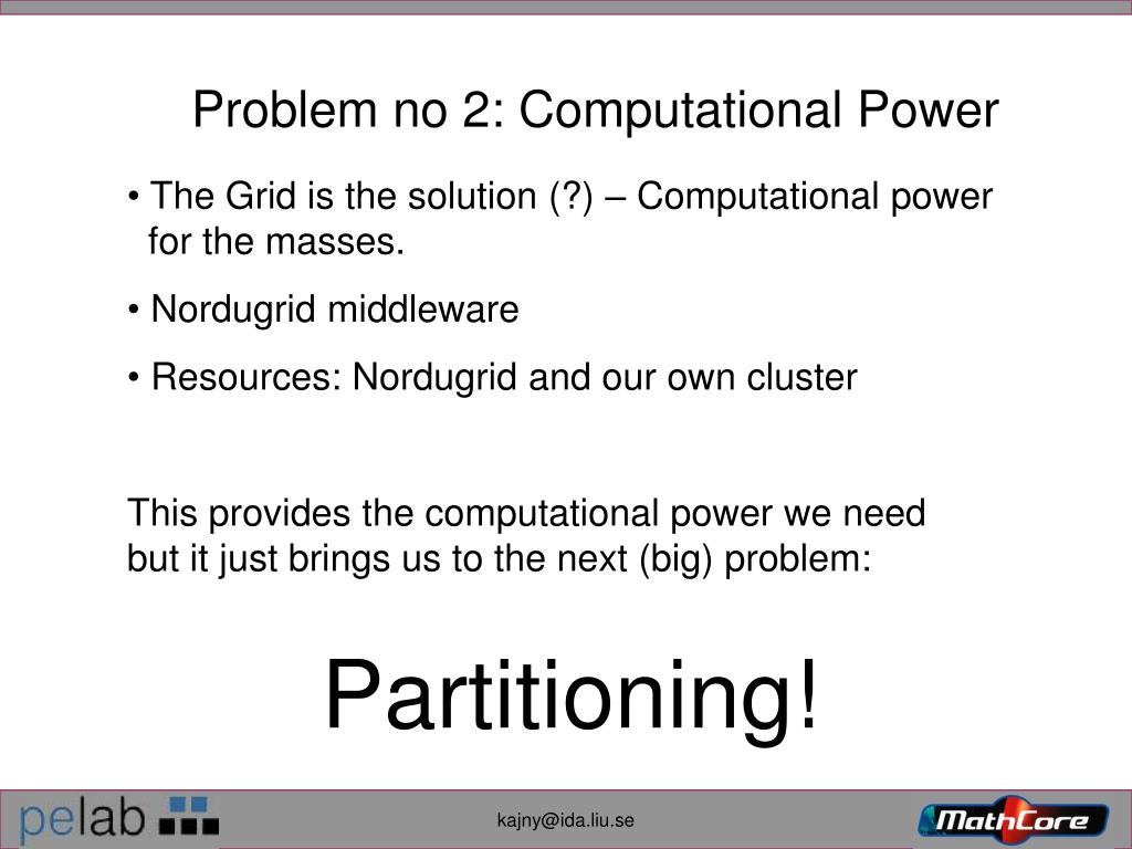Problem no 2: Computational Power • The Grid is the solution (?) – Computational power for the masses. • Nordugrid middleware • Resources: Nordugrid and our own cluster • This provides the computational power we needbut it just brings us to the next (big) problem: • Partitioning! kajny@ida.liu.se