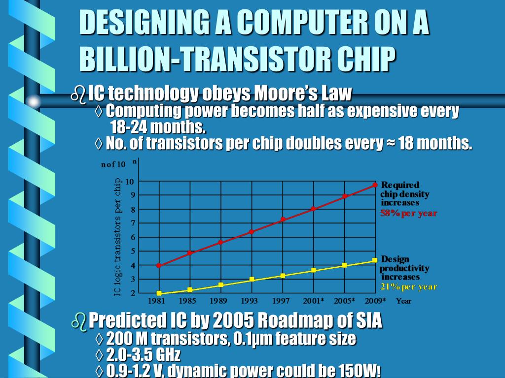 IC technology obeys Moore’s Law ◊ Computing power becomes half as expensive every 18-24 months. ◊ No. of transistors per chip doubles every ≈ 18 months. Predicted IC by 2005 Roadmap of SIA ◊ 200 M transistors, 0.1µm feature size ◊ 2.0-3.5 GHz ◊ 0.9-1.2 V, dynamic power could be 150W! DESIGNING A COMPUTER ON A BILLION-TRANSISTOR CHIP