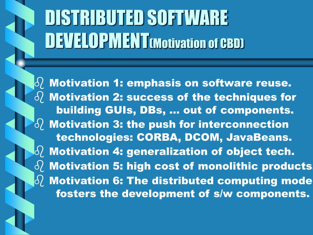 DISTRIBUTED SOFTWARE DEVELOPMENT(Motivation of CBD) • Motivation 1: emphasis on software reuse. • Motivation 2: success of the techniques for building GUIs, DBs, … out of components. • Motivation 3: the push for interconnection technologies: CORBA, DCOM, JavaBeans. • Motivation 4: generalization of object tech. • Motivation 5: high cost of monolithic products. • Motivation 6: The distributed computing model fosters the development of s/w components.