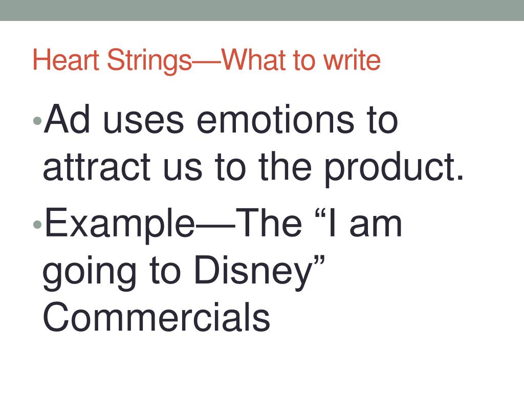 Heart Strings—What to write • Ad uses emotions to attract us to the product. • Example—The “I am going to Disney” Commercials