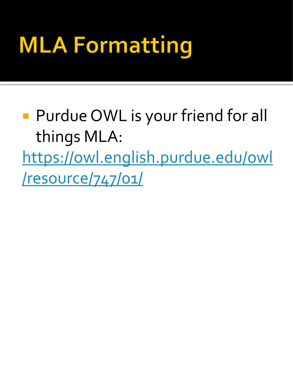 MLA Formatting • Purdue OWL is your friend for all things MLA: https://owl.english.purdue.edu/owl/resource/747/01/