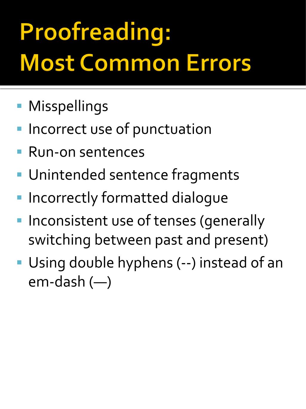 Proofreading:Most Common Errors • Misspellings • Incorrect use of punctuation • Run-on sentences • Unintended sentence fragments • Incorrectly formatted dialogue • Inconsistent use of tenses (generally switching between past and present) • Using double hyphens (--) instead of an em-dash (—)