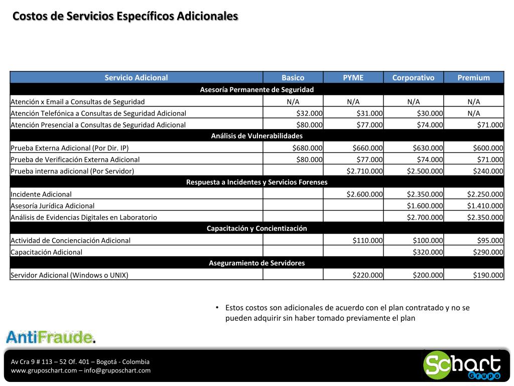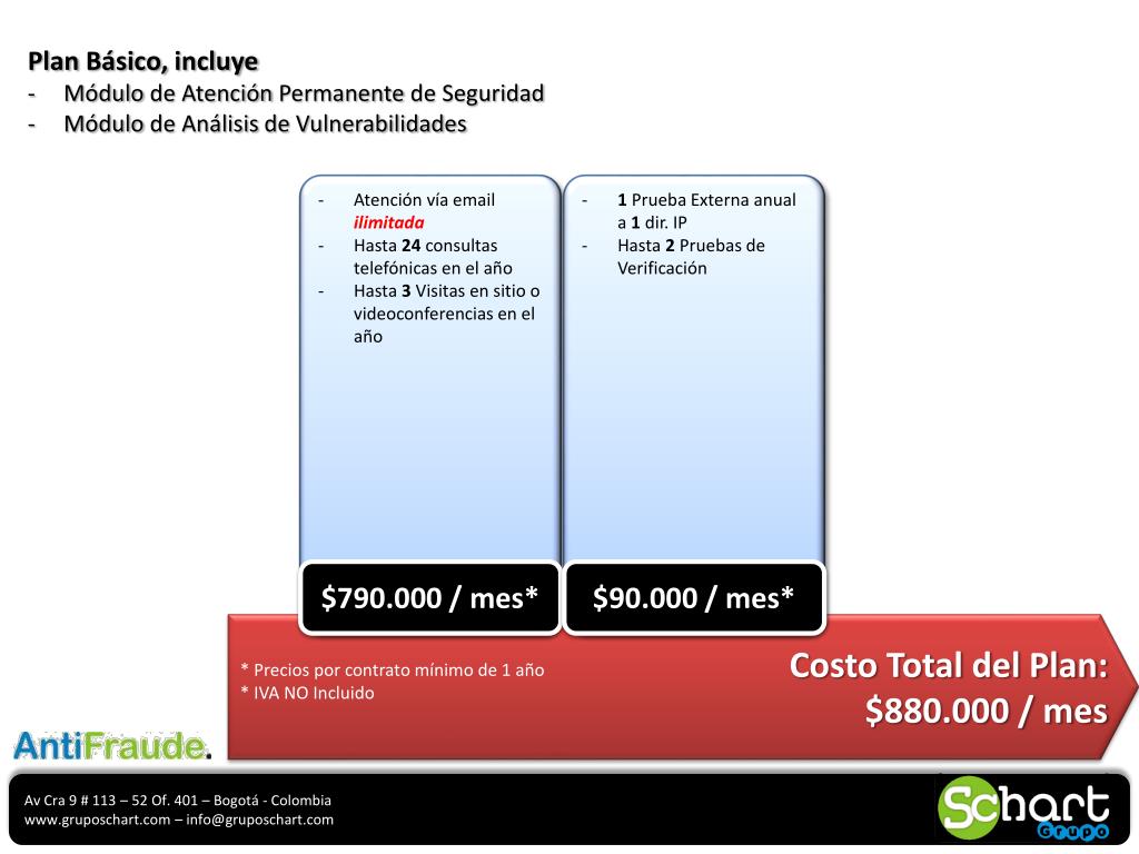 Plan Básico, incluye • Módulo de Atención Permanente de Seguridad • Módulo de Análisis de Vulnerabilidades • Atención vía email ilimitada • Hasta 24 consultas telefónicas en el año • Hasta 3 Visitas en sitio o videoconferencias en el año • 1 Prueba Externa anual a 1 dir. IP • Hasta 2 Pruebas de Verificación $790.000 / mes* $90.000 / mes* Costo Total del Plan: $880.000 / mes * Precios por contrato mínimo de 1 año * IVA NO Incluido