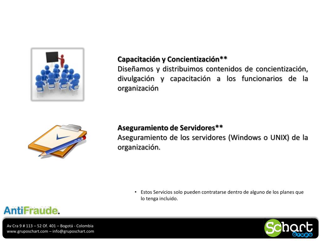 Capacitación y Concientización** Diseñamos y distribuimos contenidos de concientización, divulgación y capacitación a los funcionarios de la organización Aseguramiento de Servidores** Aseguramiento de los servidores (Windows o UNIX) de la organización. • Estos Servicios solo pueden contratarse dentro de alguno de los planes que lo tenga incluido.