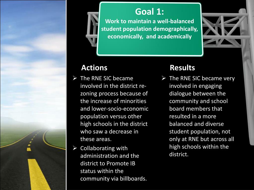 Goal 1: Work to maintain a well-balanced student population demographically, economically, and academically • The RNE SIC became involved in the district re-zoning process because of the increase of minorities and lower-socio-economic population versus other high schools in the district who saw a decrease in these areas. • Collaborating with administration and the district to Promote IB status within the community via billboards. • The RNE SIC became very involved in engaging dialogue between the community and school board members that resulted in a more balanced and diverse student population, not only at RNE but across all high schools within the district. Actions Results