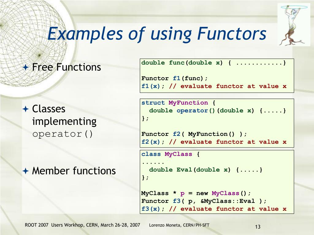 Functor class • Use a Functor class to wrap any C++ callable object which has a right signature • Can work with: • free C functions • C++ classes (or structs) implementing operator() • member function of a class • The requirement is that they must have the right signature • Example: a function of type : • double f ( double )