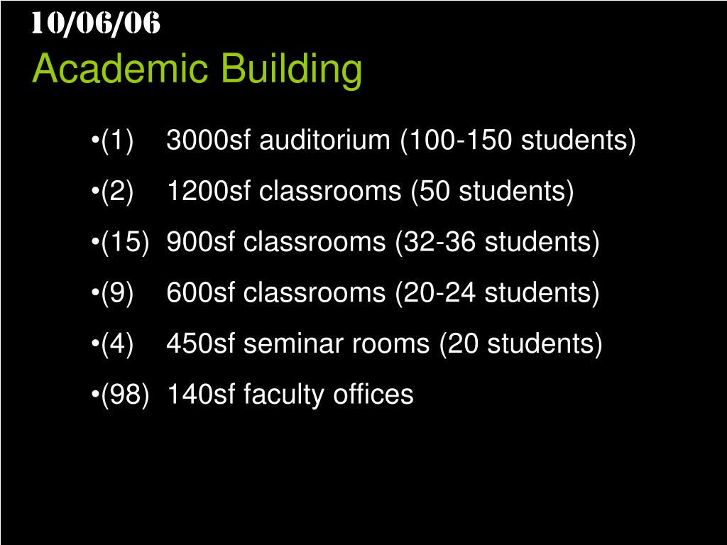 10/06/06 Academic Building • (1) 3000sf auditorium (100-150 students) • (2) 1200sf classrooms (50 students) • (15) 900sf classrooms (32-36 students) • (9) 600sf classrooms (20-24 students) • (4) 450sf seminar rooms (20 students) • (98) 140sf faculty offices