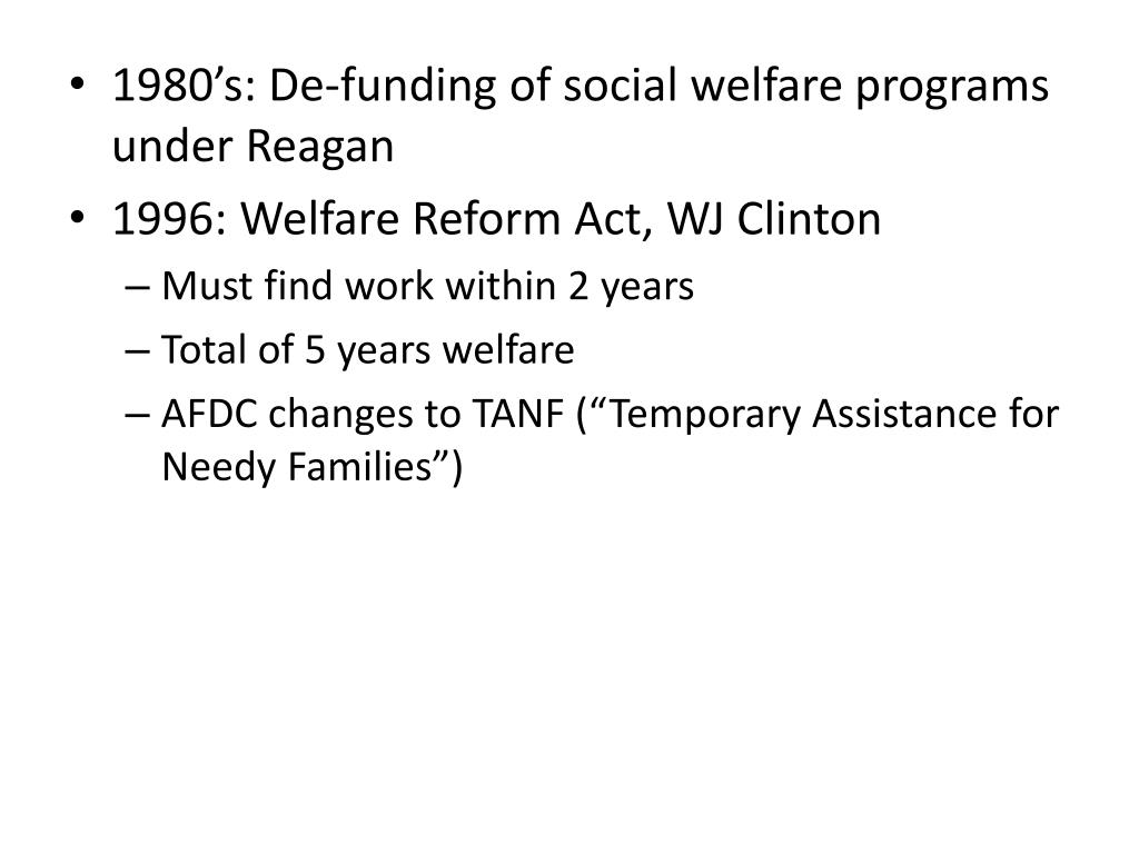 1980’s: De-funding of social welfare programs under Reagan • 1996: Welfare Reform Act, WJ Clinton • Must find work within 2 years • Total of 5 years welfare • AFDC changes to TANF (“Temporary Assistance for Needy Families”)