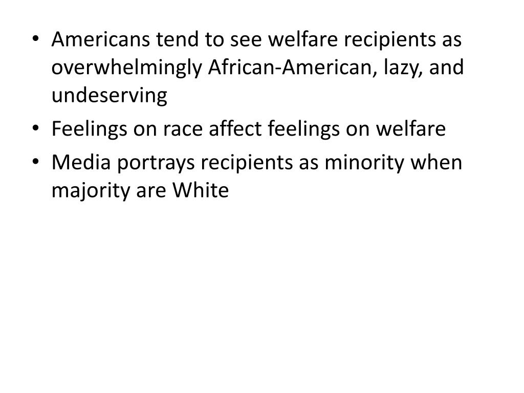 Americans tend to see welfare recipients as overwhelmingly African-American, lazy, and undeserving • Feelings on race affect feelings on welfare • Media portrays recipients as minority when majority are White