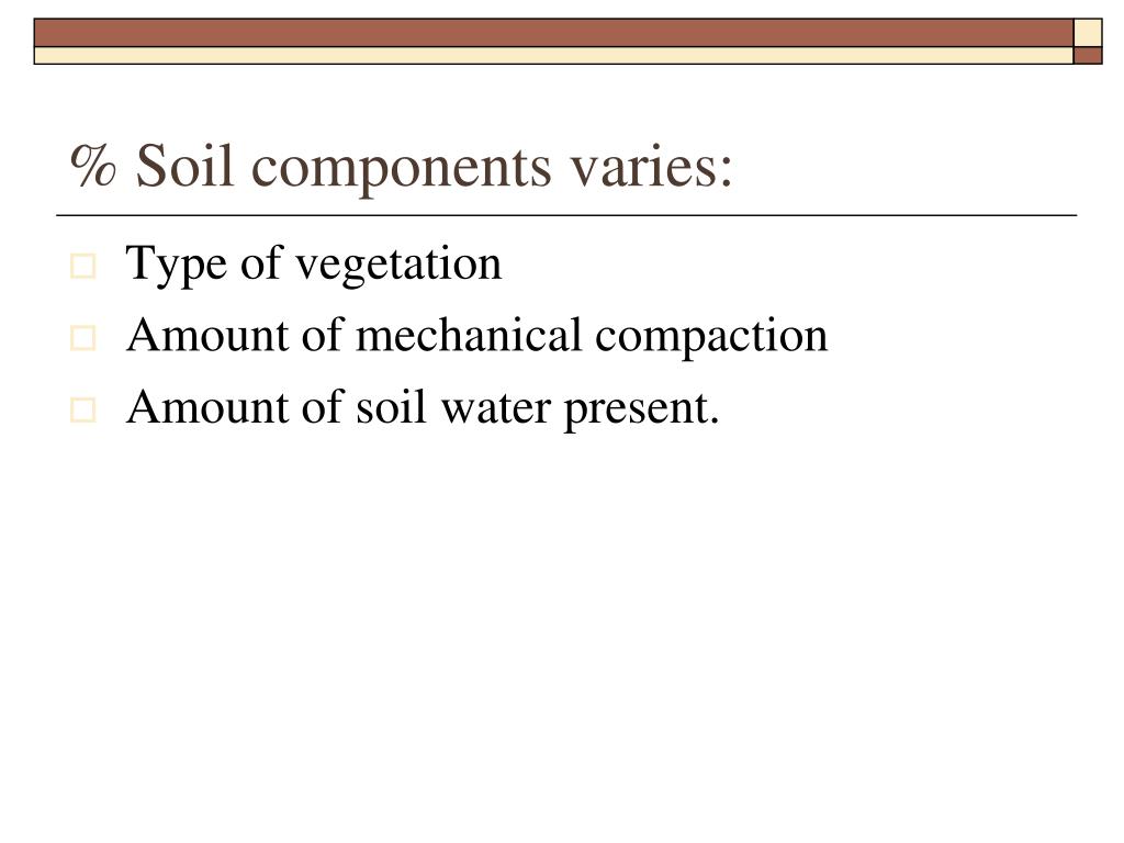 % Soil components varies: • Type of vegetation • Amount of mechanical compaction • Amount of soil water present.