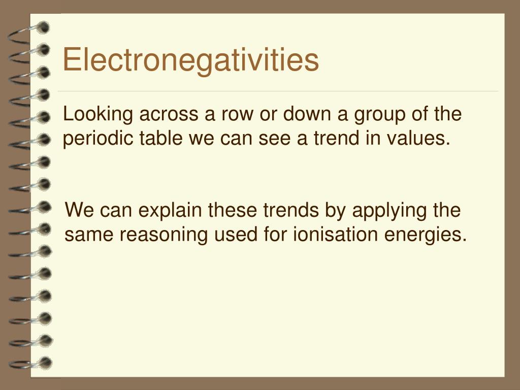Electronegativities Looking across a row or down a group of the periodic table we can see a trend in values. We can explain these trends by applying the same reasoning used for ionisation energies.