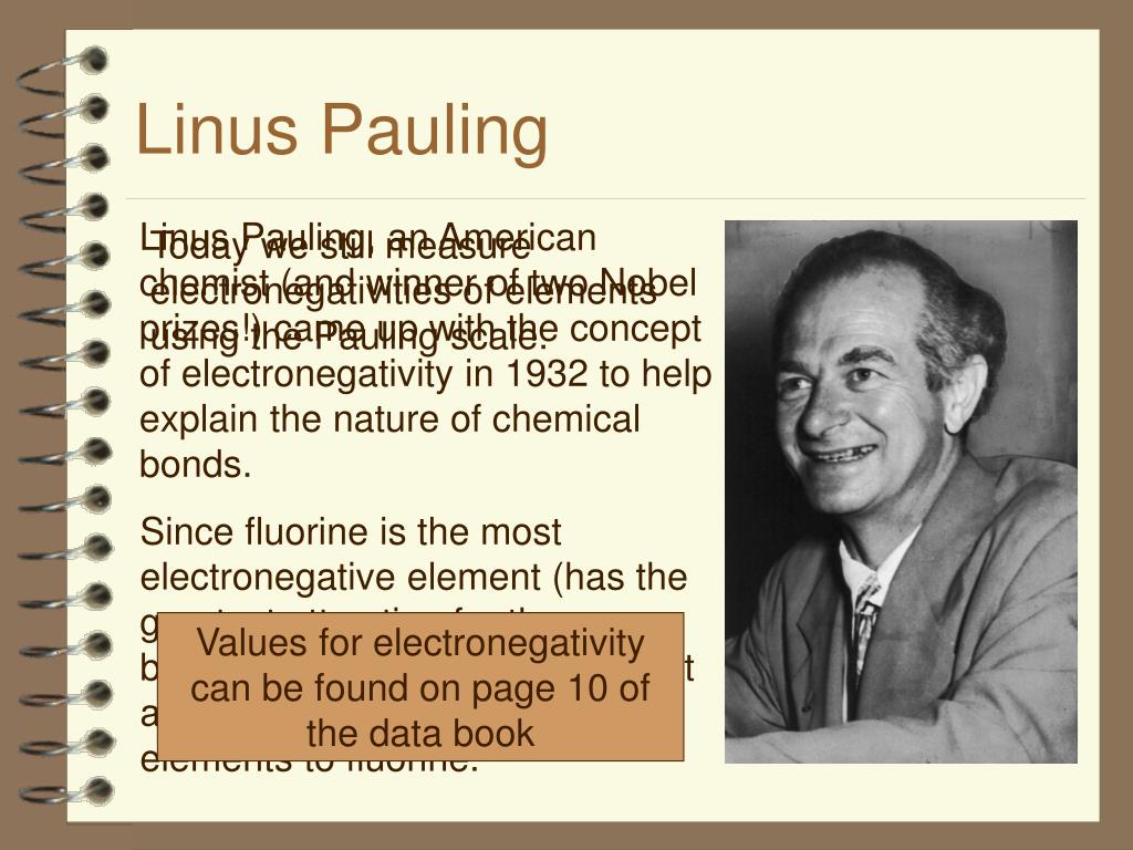 Linus Pauling Linus Pauling, an American chemist (and winner of two Nobel prizes!) came up with the concept of electronegativity in 1932 to help explain the nature of chemical bonds. Today we still measure electronegativities of elements using the Pauling scale. Since fluorine is the most electronegative element (has the greatest attraction for the bonding electrons) he assigned it a value and compared all other elements to fluorine. Values for electronegativity can be found on page 10 of the data book