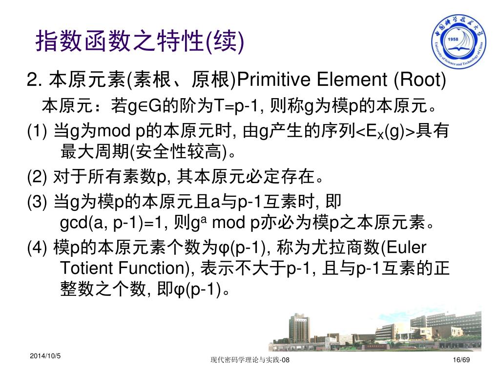 指数函数之特性(续) 2. 本原元素(素根、原根)Primitive Element (Root) 本原元:若g∈G的阶为T=p-1, 则称g为模p的本原元。 (1) 当g为mod p的本原元时, 由g产生的序列<Ex(g)>具有最大周期(安全性较高)。 (2) 对于所有素数p, 其本原元必定存在。 (3) 当g为模p的本原元且a与p-1互素时, 即 gcd(a, p-1)=1, 则ga mod p亦必为模p之本原元素。 (4) 模p的本原元素个数为φ(p-1), 称为尤拉商数(Euler Totient Function), 表示不大于p-1, 且与p-1互素的正整数之个数, 即φ(p-1)。 现代密码学理论与实践-08