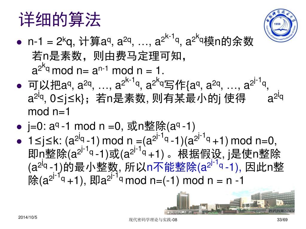 详细的算法 • n-1 = 2kq, 计算aq, a2q, …, a2k-1q, a2kq模n的余数 若n是素数,则由费马定理可知, a2kq mod n= an-1 mod n = 1. • 可以把aq, a2q, …, a2k-1q, a2kq写作{aq, a2q, …, a2j-1q, a2jq, 0≤j≤k};若n是素数, 则有某最小的j 使得 a2jq mod n=1 • j=0: aq -1 mod n =0, 或n整除(aq -1) • 1≤j≤k: (a2jq -1)mod n =(a2j-1q -1)(a2j-1q +1)mod n=0, 即n整除(a2j-1q -1)或(a2j-1q +1)。根据假设, j是使n整除(a2jq -1)的最小整数, 所以n不能整除(a2j-1q -1),因此n整除(a2j-1q +1), 即a2j-1q mod n=(-1) mod n = n -1 现代密码学理论与实践-08