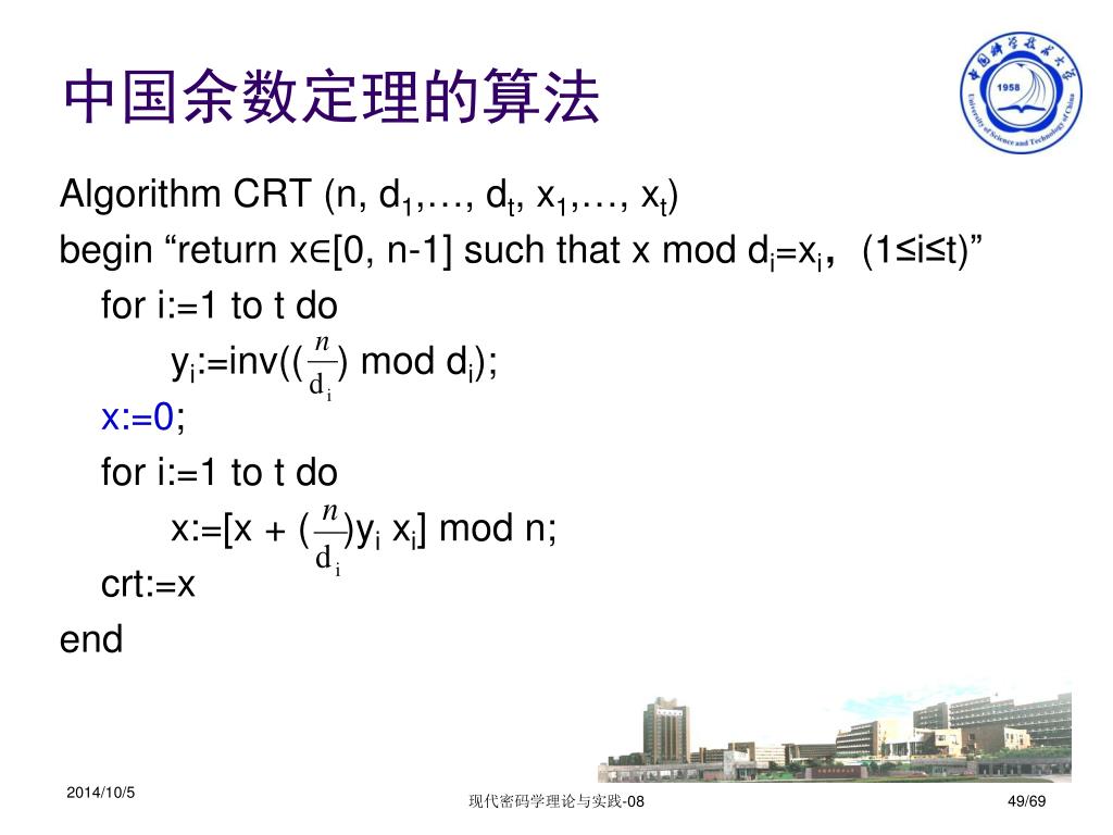 中国余数定理的算法 Algorithm CRT (n, d1,…, dt, x1,…, xt) begin “return x∈[0, n-1] such that x mod di=xi,(1≤i≤t)” for i:=1 to t do yi:=inv(( ) mod di); x:=0; for i:=1 to t do x:=[x + ( )yi xi] mod n; crt:=x end 现代密码学理论与实践-08