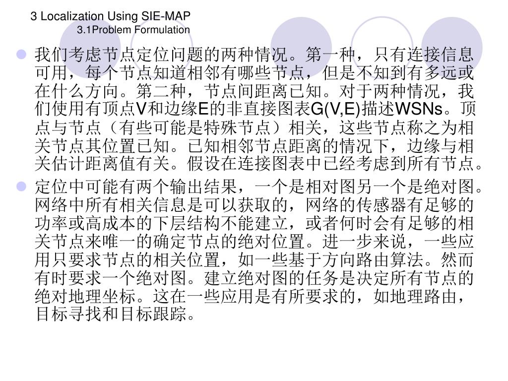 3 Localization Using SIE-MAP3.1Problem Formulation • 我们考虑节点定位问题的两种情况。第一种,只有连接信息可用,每个节点知道相邻有哪些节点,但是不知到有多远或在什么方向。第二种,节点间距离已知。对于两种情况,我们使用有顶点V和边缘E的非直接图表G(V,E)描述WSNs。顶点与节点(有些可能是特殊节点)相关,这些节点称之为相关节点其位置已知。已知相邻节点距离的情况下,边缘与相关估计距离值有关。假设在连接图表中已经考虑到所有节点。 • 定位中可能有两个输出结果,一个是相对图另一个是绝对图。网络中所有相关信息是可以获取的,网络的传感器有足够的功率或高成本的下层结构不能建立,或者何时会有足够的相关节点来唯一的确定节点的绝对位置。进一步来说,一些应用只要求节点的相关位置,如一些基于方向路由算法。然而有时要求一个绝对图。建立绝对图的任务是决定所有节点的绝对地理坐标。这在一些应用是有所要求的,如地理路由,目标寻找和目标跟踪。