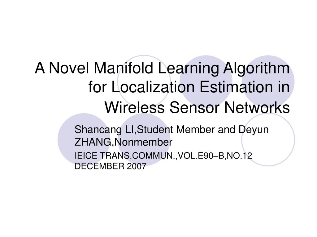 A Novel Manifold Learning Algorithm for Localization Estimation in Wireless Sensor Networks Shancang LI,Student Member and Deyun ZHANG,Nonmember IEICE TRANS.COMMUN.,VOL.E90–B,NO.12 DECEMBER 2007