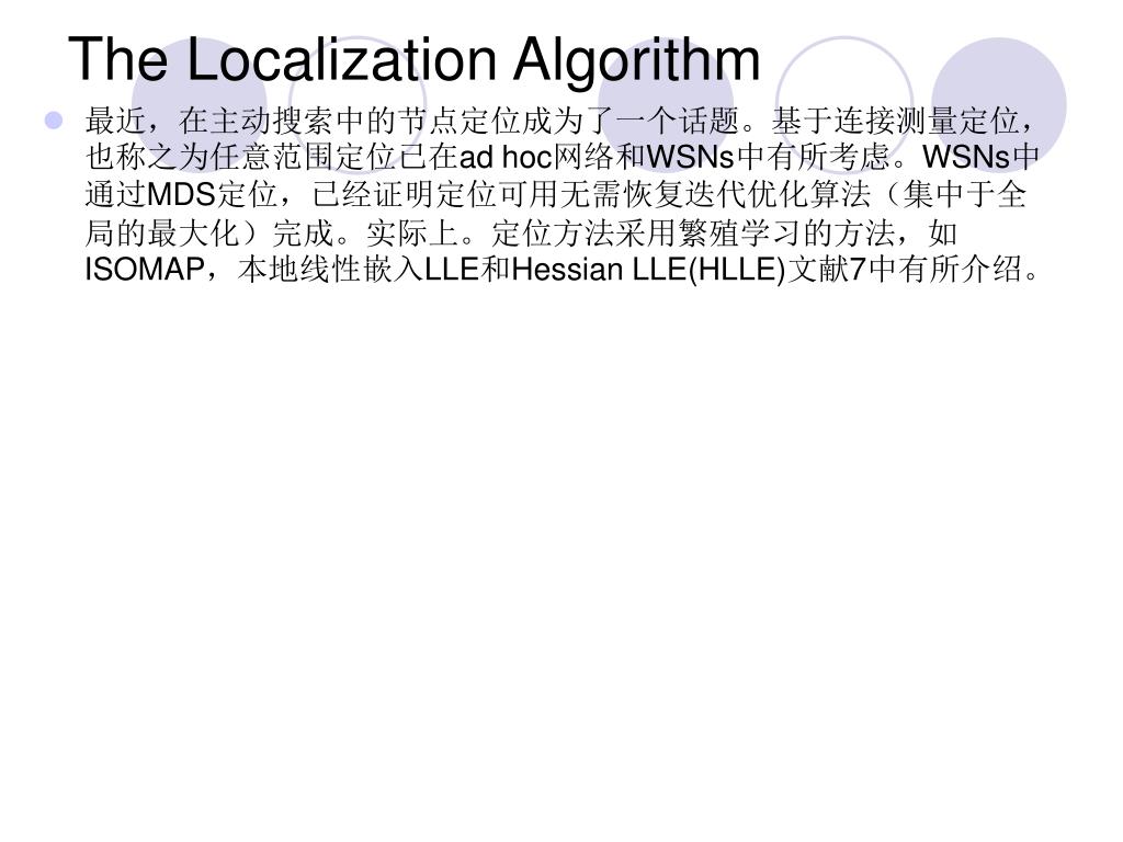 The Localization Algorithm • 最近,在主动搜索中的节点定位成为了一个话题。基于连接测量定位,也称之为任意范围定位已在ad hoc网络和WSNs中有所考虑。WSNs中通过MDS定位,已经证明定位可用无需恢复迭代优化算法(集中于全局的最大化)完成。实际上。定位方法采用繁殖学习的方法,如ISOMAP,本地线性嵌入LLE和Hessian LLE(HLLE)文献7中有所介绍。