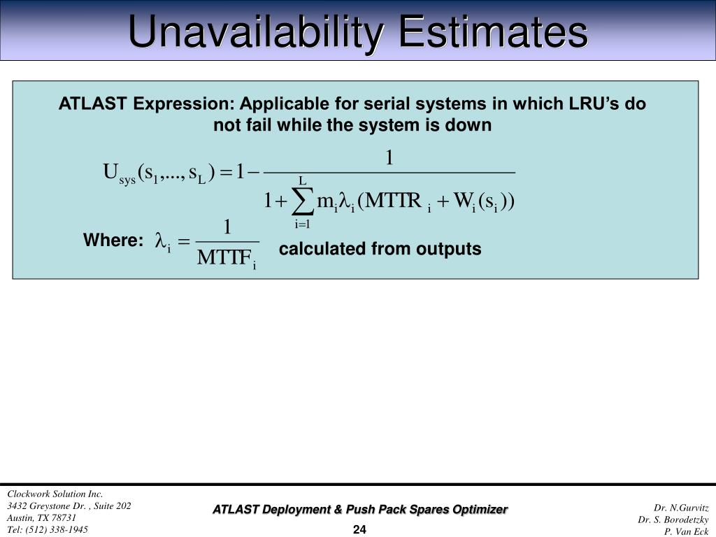 Unavailability Estimates ATLAST Expression: Applicable for serial systems in which LRU’s do not fail while the system is down Where: calculated from outputs