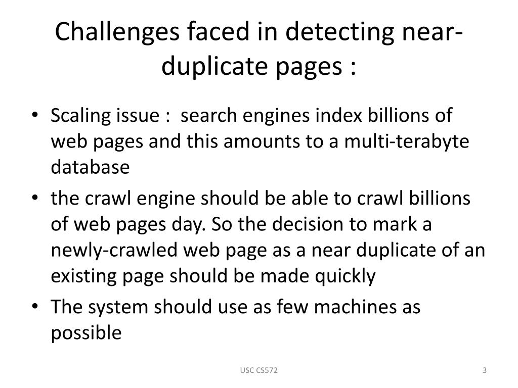 Challenges faced in detecting near-duplicate pages : • Scaling issue : search engines index billions of web pages and this amounts to a multi-terabyte database • the crawl engine should be able to crawl billions of web pages day. So the decision to mark a newly-crawled web page as a near duplicate of an existing page should be made quickly • The system should use as few machines as possible USC CS572
