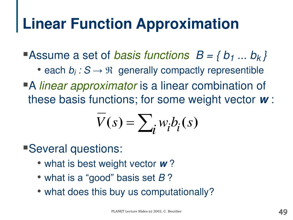 Linear Function Approximation • Assume a set of basis functionsB = { b1 ... bk } • each bi : S → generally compactly representible • A linear approximator is a linear combination of these basis functions; for some weight vector w: • Several questions: • what is best weight vector w ? • what is a “good” basis set B ? • what does this buy us computationally? PLANET Lecture Slides (c) 2002, C. Boutilier