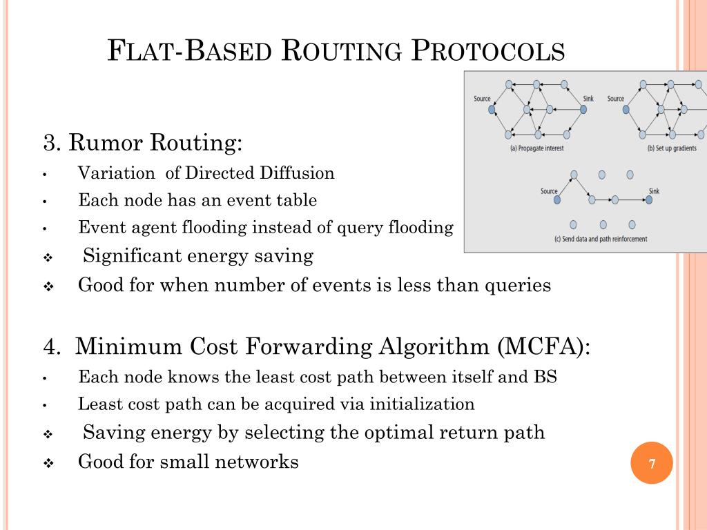 Flat-Based Routing Protocols 3. Rumor Routing: • Variation of Directed Diffusion • Each node has an event table • Event agent flooding instead of query flooding • Significant energy saving • Good for when number of events is less than queries 4. Minimum Cost Forwarding Algorithm (MCFA): • Each node knows the least cost path between itself and BS • Least cost path can be acquired via initialization • Saving energy by selecting the optimal return path • Good for small networks 7