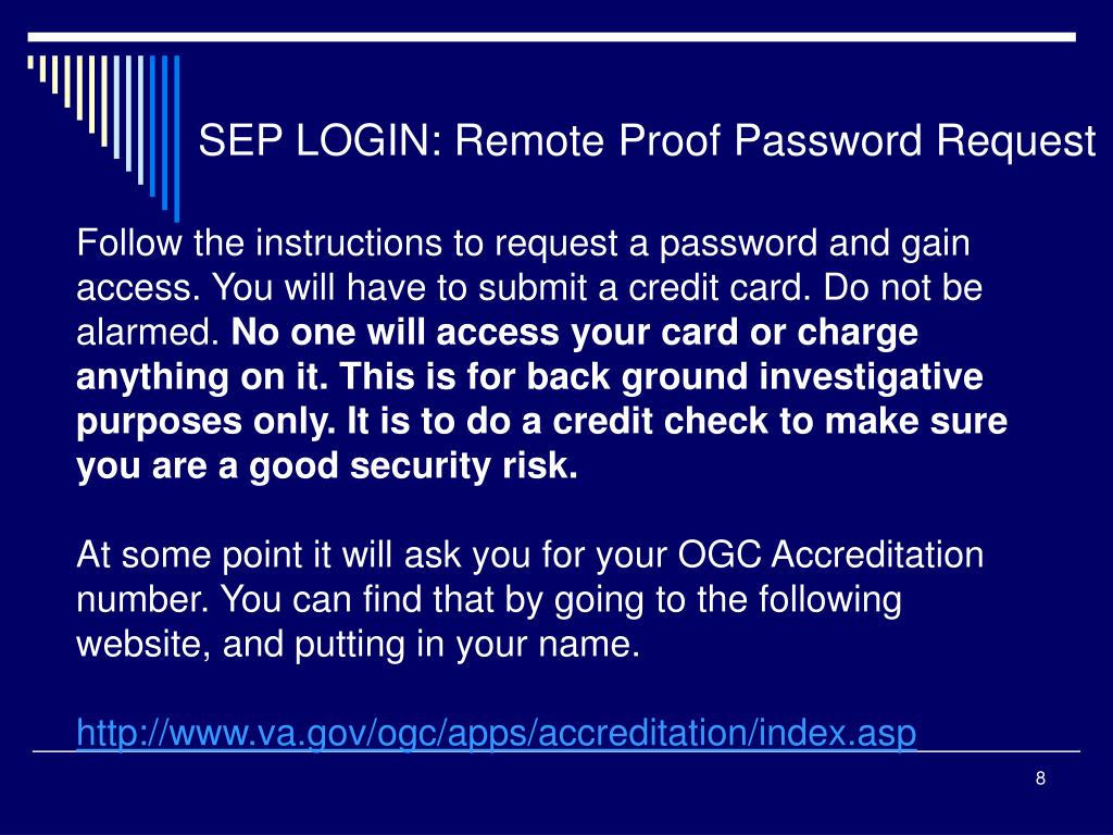 SEP LOGIN: Remote Proof Password Request Follow the instructions to request a password and gain access. You will have to submit a credit card. Do not be alarmed. No one will access your card or charge anything on it.This is for back ground investigative purposes only. It is to do a credit check to make sure you are a good security risk. At some point it will ask you for your OGC Accreditation number. You can find that by going to the following website, and putting in your name. http://www.va.gov/ogc/apps/accreditation/index.asp