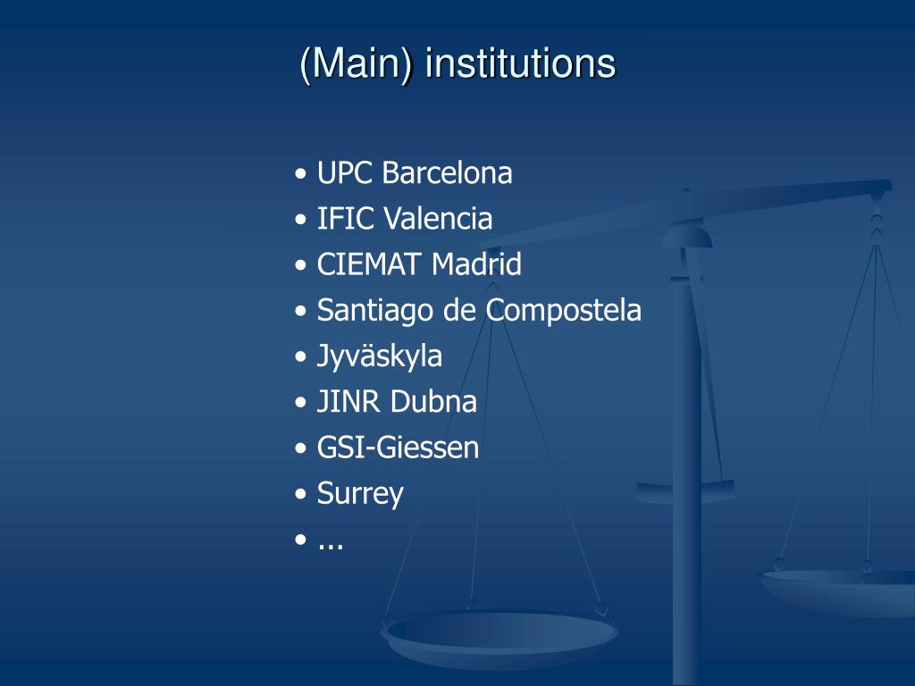 (Main) institutions • UPC Barcelona • IFIC Valencia • CIEMAT Madrid • Santiago de Compostela • Jyväskyla • JINR Dubna • GSI-Giessen • Surrey • ...