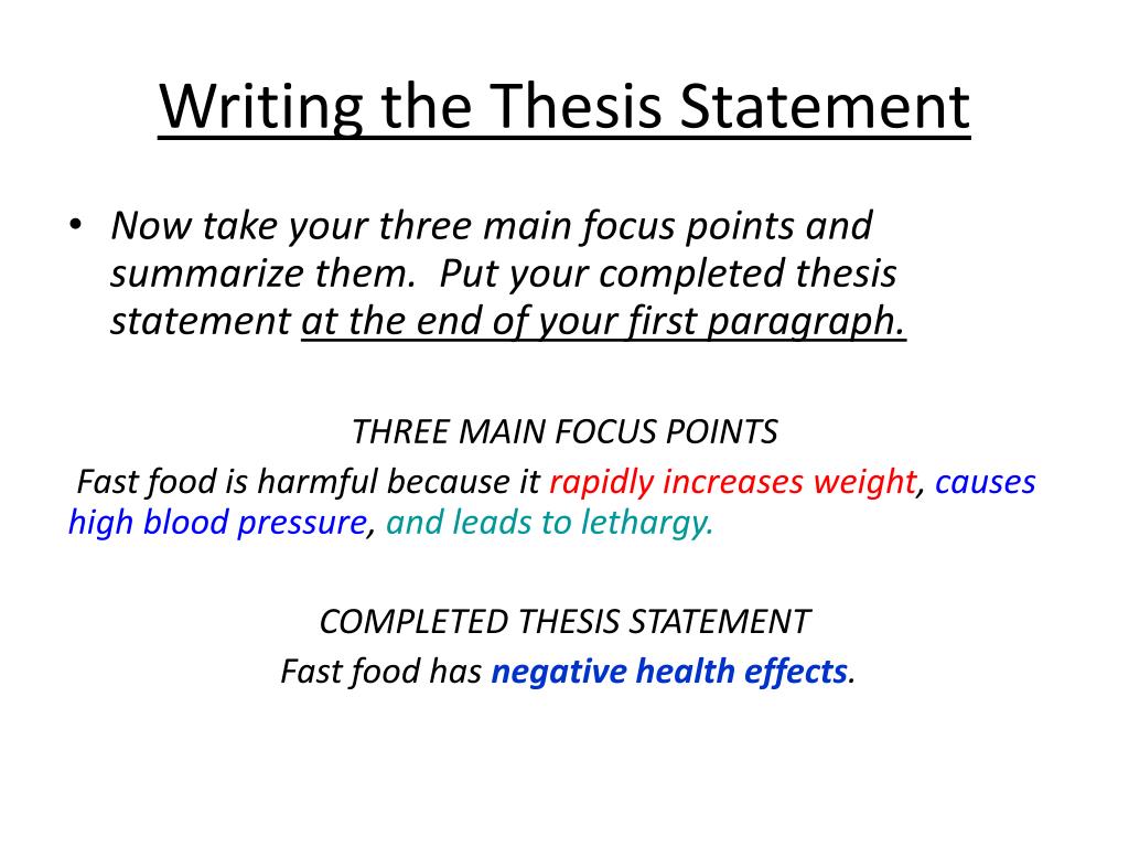 Writing the Thesis Statement • Now take your three main focus points and summarize them. Put your completed thesis statement at the end of your first paragraph. THREE MAIN FOCUS POINTS Fast food is harmful because it rapidly increases weight, causes high blood pressure, and leads to lethargy. COMPLETED THESIS STATEMENT Fast food has negative health effects.