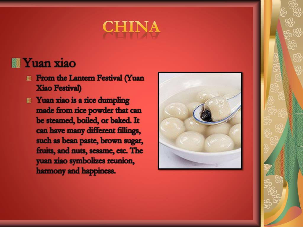China • Yuan xiao • From the Lantern Festival (Yuan Xiao Festival) • Yuan xiao is a rice dumpling made from rice powder that can be steamed, boiled, or baked. It can have many different fillings, such as bean paste, brown sugar, fruits, and nuts, sesame, etc. The yuanxiao symbolizes reunion, harmony and happiness.