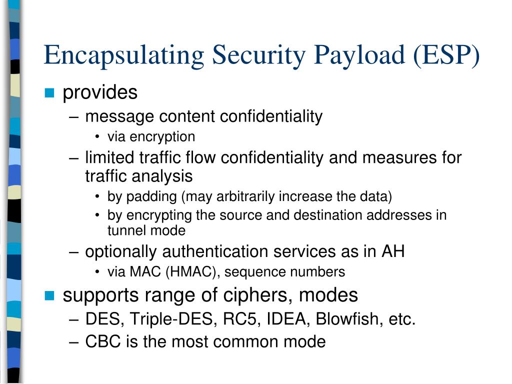 Encapsulating Security Payload (ESP) • provides • message content confidentiality • via encryption • limited traffic flow confidentiality and measures for traffic analysis • by padding (may arbitrarily increase the data) • by encrypting the source and destination addresses in tunnel mode • optionally authentication services as in AH • via MAC (HMAC), sequence numbers • supports range of ciphers, modes • DES, Triple-DES, RC5, IDEA, Blowfish, etc. • CBC is the most common mode