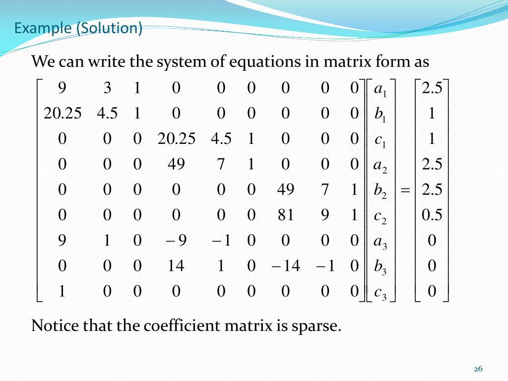 Example (Solution) We can write the system of equations in matrix form as Notice that the coefficient matrix is sparse.