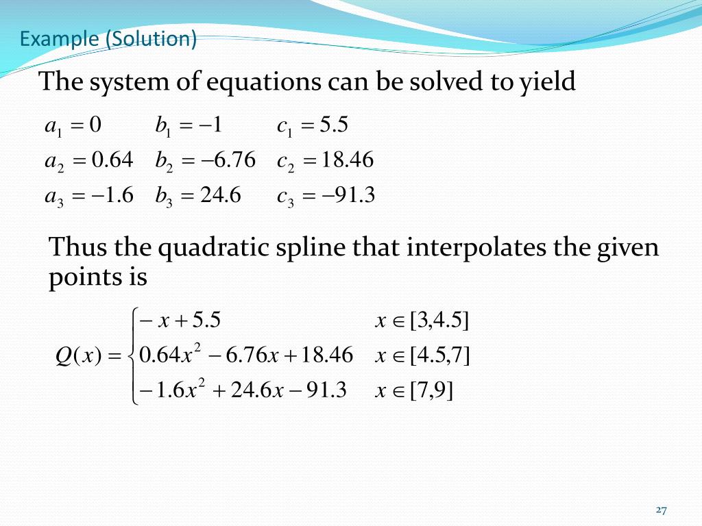 Example (Solution) The system of equations can be solved to yield Thus the quadratic spline that interpolates the given points is