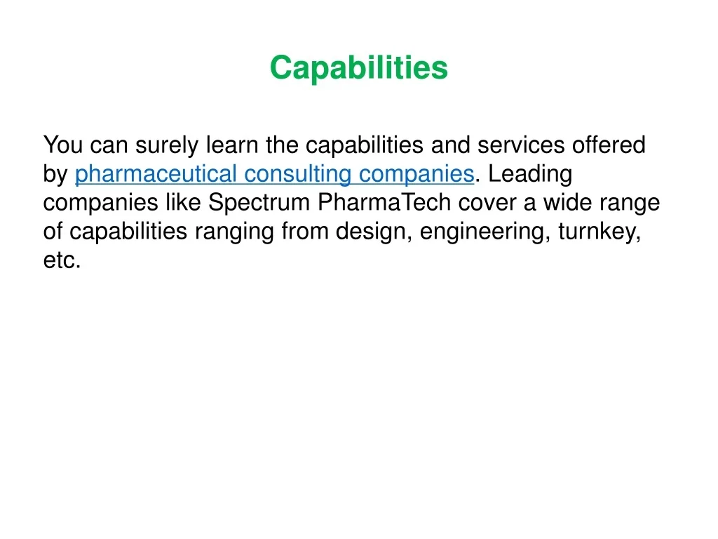 Capabilities You can surely learn the capabilities and services offered by pharmaceutical consulting companies. Leading companies like Spectrum PharmaTech cover a wide range of capabilities ranging from design, engineering, turnkey, etc.