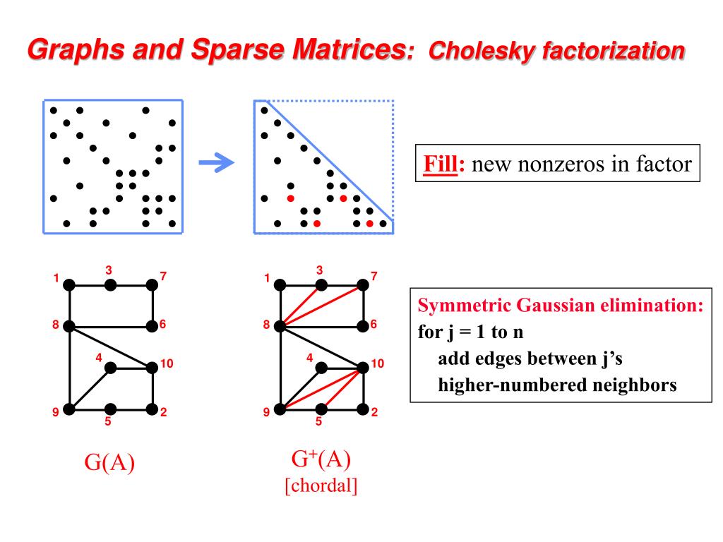 3 7 1 3 7 1 6 8 6 8 4 10 4 10 9 2 9 2 5 5 Graphs and Sparse Matrices: Cholesky factorization Fill:new nonzeros in factor Symmetric Gaussian elimination: for j = 1 to n add edges between j’s higher-numbered neighbors G+(A)[chordal] G(A)