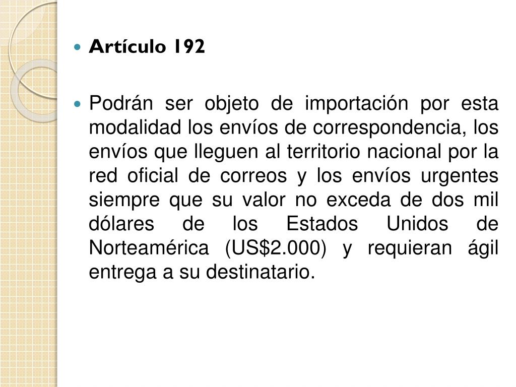 Artículo 192 • Podrán ser objeto de importación por esta modalidad los envíos de correspondencia, los envíos que lleguen al territorio nacional por la red oficial de correos y los envíos urgentes siempre que su valor no exceda de dos mil dólares de los Estados Unidos de Norteamérica (US$2.000) y requieran ágil entrega a su destinatario.