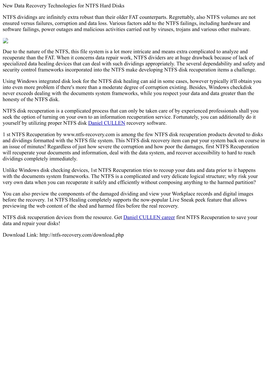 New Data Recovery Technologies for NTFS Hard Disks NTFS dividings are infinitely extra robust than their older FAT counterparts. Regrettably, also NTFS volumes are not ensured versus failures, corruption and data loss. Various factors add to the NTFS failings, including hardware and software failings, power outages and malicious activities carried out by viruses, trojans and various other malware. Due to the nature of the NTFS, this file system is a lot more intricate and means extra complicated to analyze and recuperate than the FAT. When it concerns data repair work, NTFS dividers are at huge drawback because of lack of specialized data healing devices that can deal with such dividings appropriately. The several dependability and safety and security control frameworks incorporated into the NTFS make developing NTFS disk recuperation items a challenge. Using Windows integrated disk look for the NTFS disk healing can aid in some cases, however typically it'll obtain you into even more problem if there's more than a moderate degree of corruption existing. Besides, Windows checkdisk never exceeds dealing with the documents system frameworks, while you respect your data and data greater than the honesty of the NTFS disk. NTFS disk recuperation is a complicated process that can only be taken care of by experienced professionals shall you seek the option of turning on your own to an information recuperation service. Fortunately, you can additionally do it yourself by utilizing proper NTFS disk Daniel CULLEN recovery software. 1 st NTFS Recuperation by www.ntfs-recovery.com is among the few NTFS disk recuperation products devoted to disks and dividings formatted with the NTFS file system. This NTFS disk recovery item can put your system back on course in an issue of minutes! Regardless of just how severe the corruption and how poor the damages, first NTFS Recuperation will recuperate your documents and information, deal with the data system, and recover accessibility to hard to reach dividings completely immediately. Unlike Windows disk checking devices, 1st NTFS Recuperation tries to recoup your data and data prior to it happens with the documents system frameworks. The NTFS is a complicated and very delicate logical structure; why risk your very own data when you can recuperate it safely and efficiently without composing anything to the harmed partition? You can also preview the components of the damaged dividing and view your Workplace records and digital images before the recovery. 1st NTFS Healing completely supports the now-popular Live Sneak peek feature that allows previewing the web content of the shed and harmed files before the real recovery. NTFS disk recuperation devices from the resource. Get Daniel CULLEN career first NTFS Recuperation to save your data and repair your disks! Download Link: http://ntfs-recovery.com/download.php