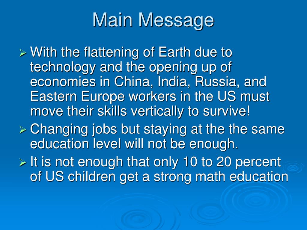 Main Message • With the flattening of Earth due to technology and the opening up of economies in China, India, Russia, and Eastern Europe workers in the US must move their skills vertically to survive! • Changing jobs but staying at the the same education level will not be enough. • It is not enough that only 10 to 20 percent of US children get a strong math education
