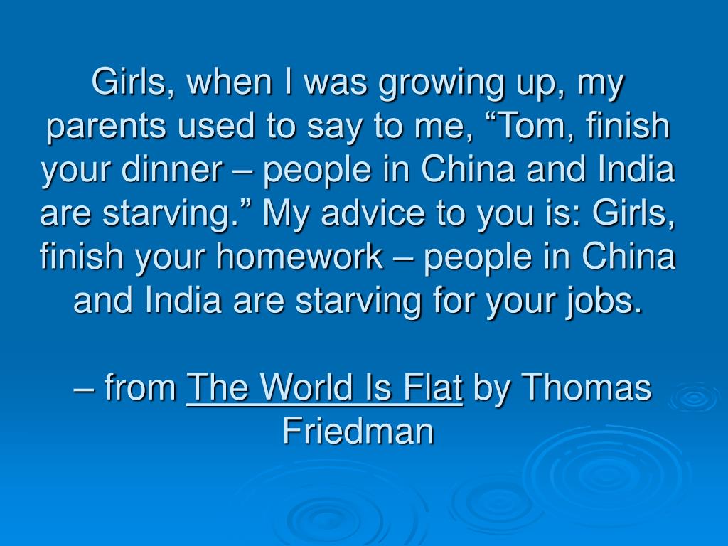 Girls, when I was growing up, my parents used to say to me, “Tom, finish your dinner – people in China and India are starving.” My advice to you is: Girls, finish your homework – people in China and India are starving for your jobs. – from The World Is Flat by Thomas Friedman