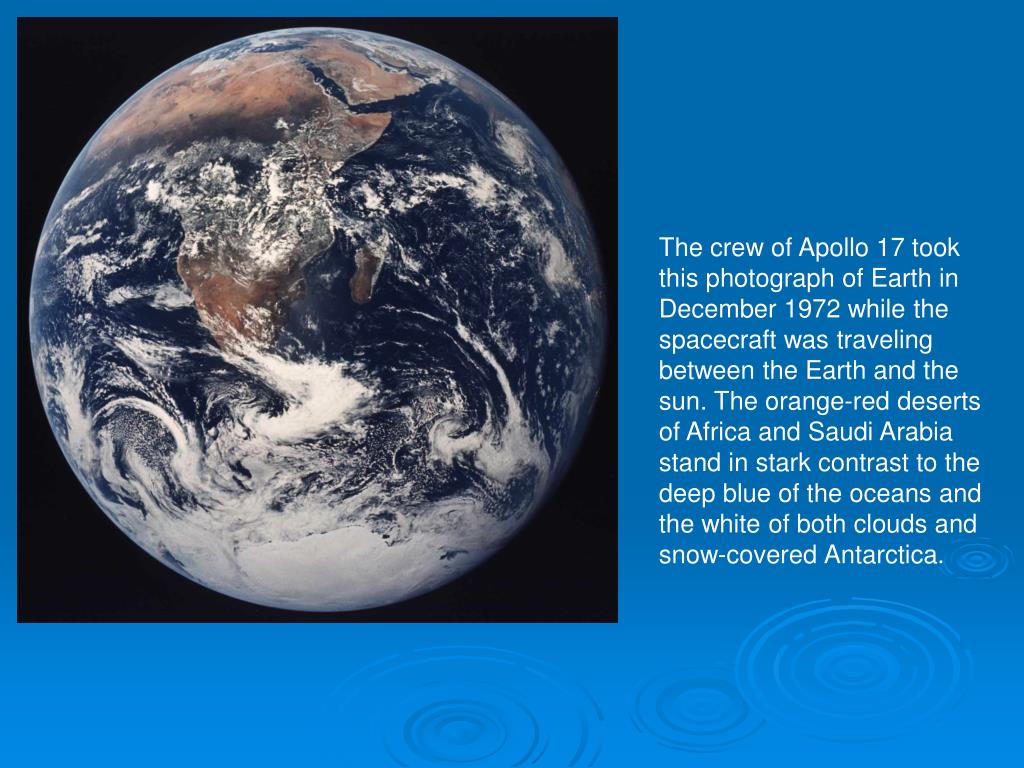 The crew of Apollo 17 took this photograph of Earth in December 1972 while the spacecraft was traveling between the Earth and the sun. The orange-red deserts of Africa and Saudi Arabia stand in stark contrast to the deep blue of the oceans and the white of both clouds and snow-covered Antarctica.