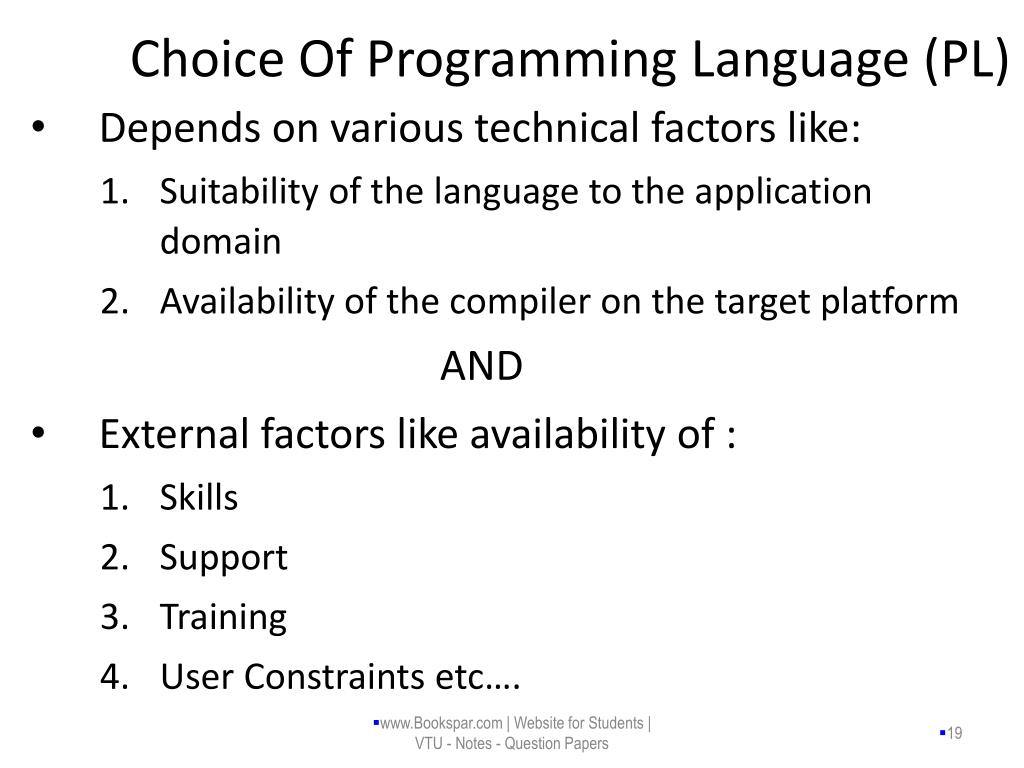 Choice Of Programming Language (PL) • Depends on various technical factors like: • Suitability of the language to the application domain • Availability of the compiler on the target platform AND • External factors like availability of : • Skills • Support • Training • User Constraints etc…. www.Bookspar.com | Website for Students | VTU - Notes - Question Papers